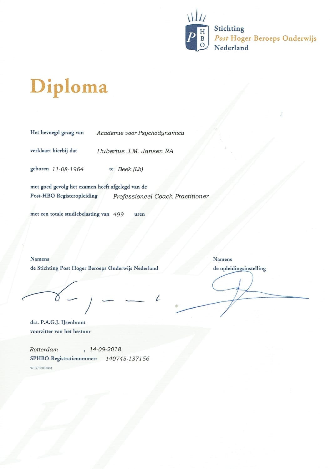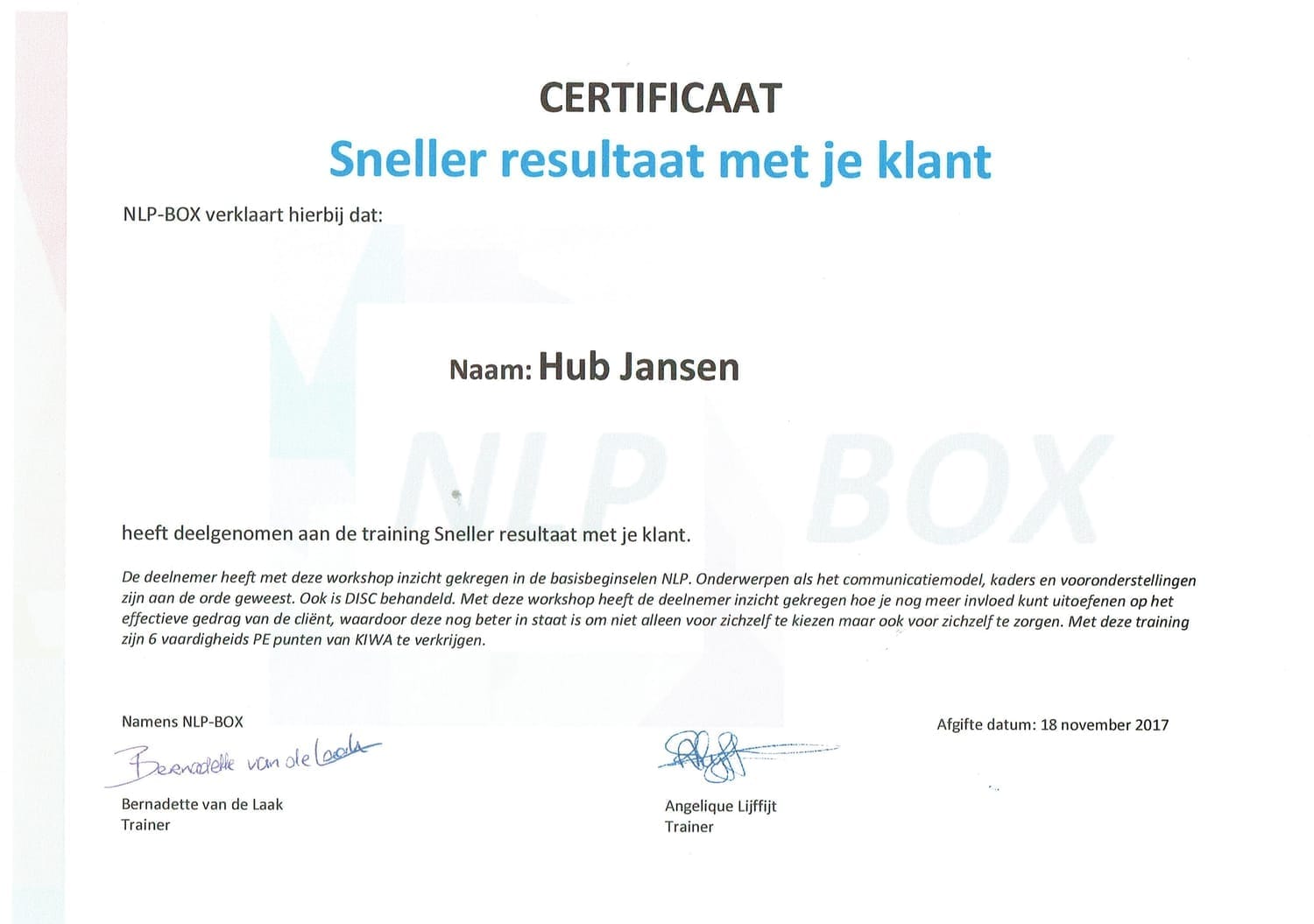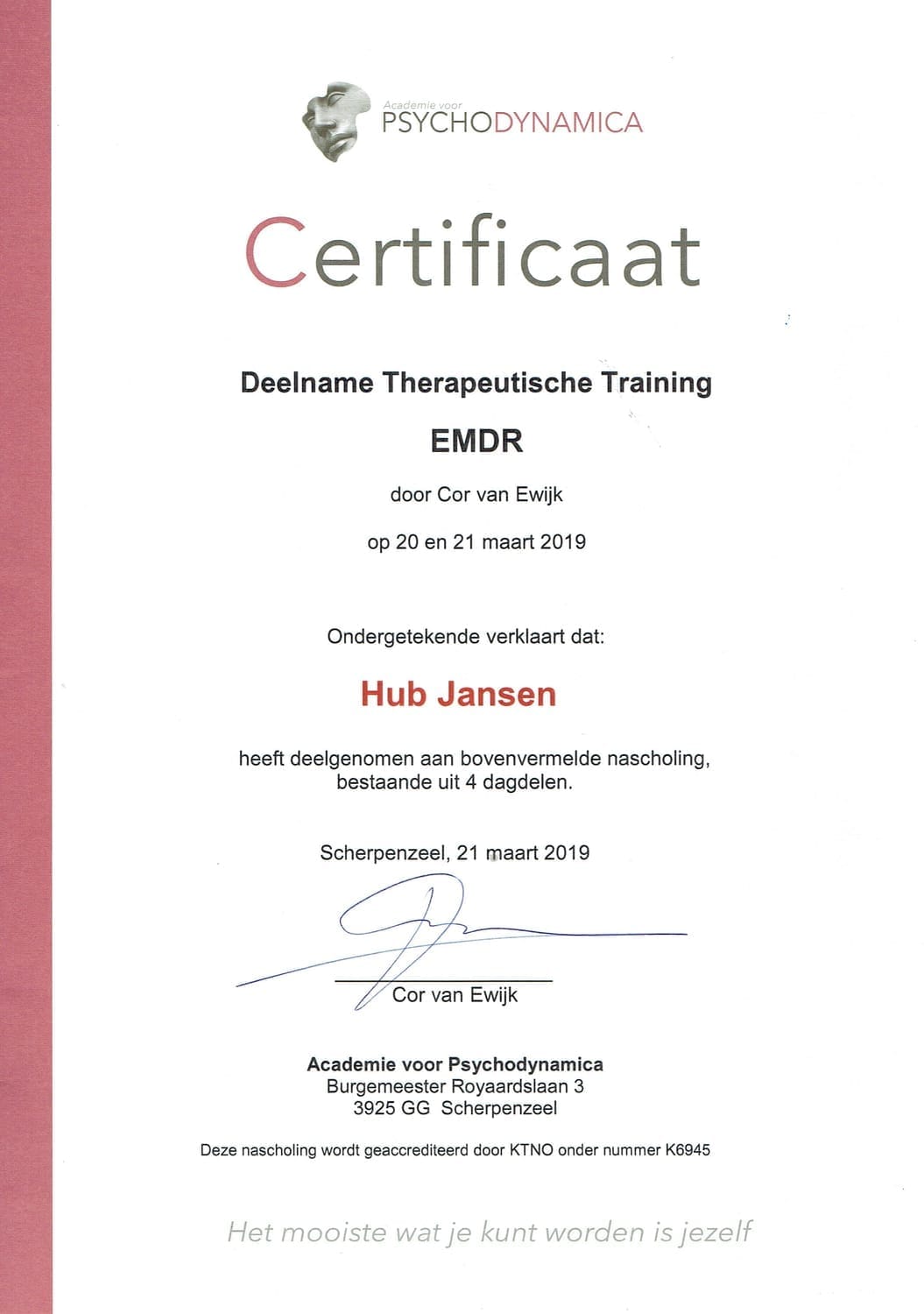 Mijn toewijding aan persoonlijke en professionele groei is een doorlopend proces. In de afgelopen 25 jaar heb ik meer dan 200 boeken over psychologie en menselijk gedrag bestudeerd. Deze diepgaande zelfstudie, gecombineerd met het volgen van relevante opleidingen, stelt mij in staat om mijn kennis voortdurend te actualiseren. Op deze manier zorg ik ervoor dat ik altijd de meest effectieve en up-to-date methoden kan toepassen in mijn werk.