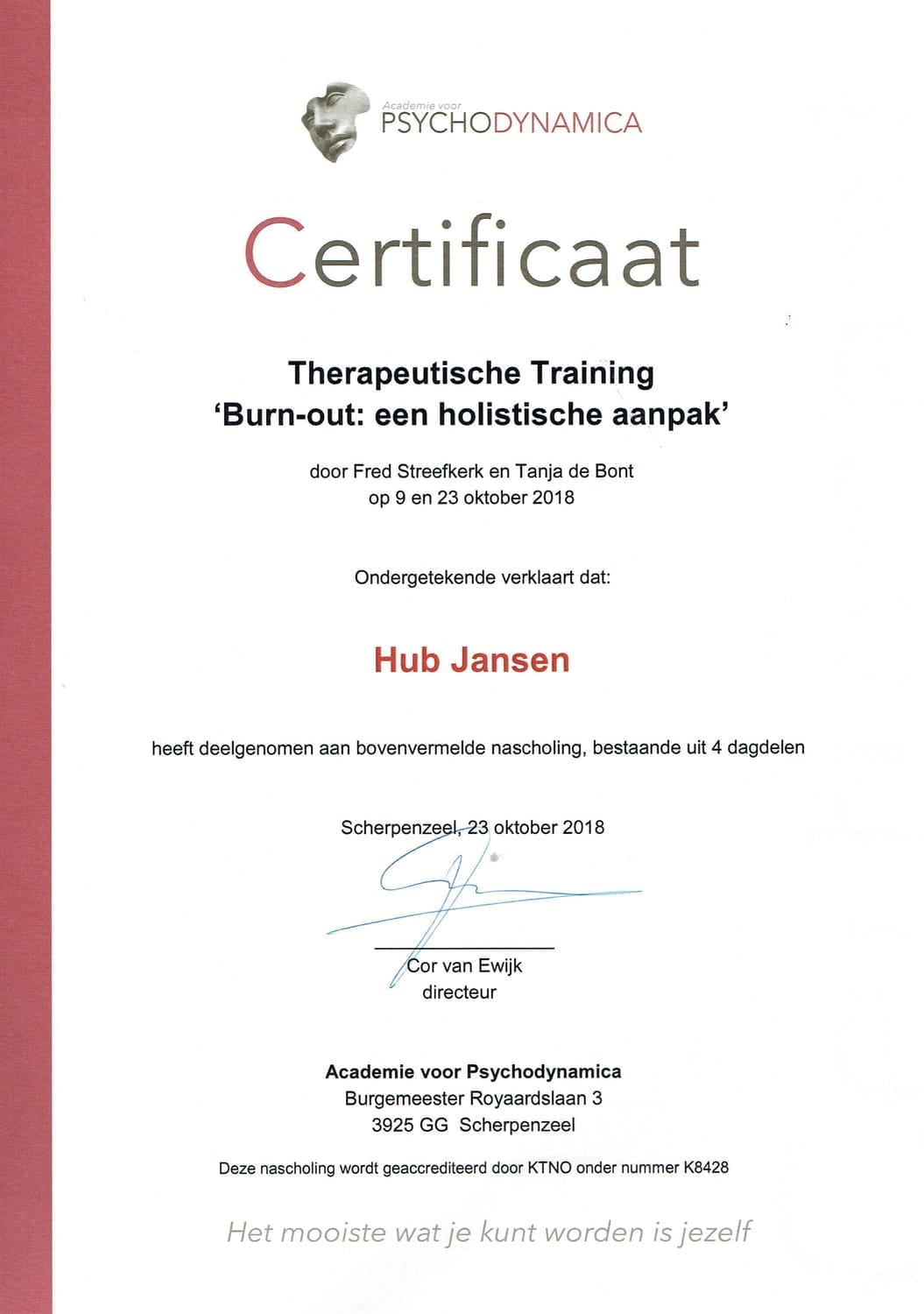 Een persoonlijke burn-out in 2000 was het keerpunt in mijn leven. Het zette me aan het denken over menselijk gedrag en de diepere oorzaken van stress en ongemak. Dit inspireerde mij om me te verdiepen in de menselijke psyche en verschillende opleidingen te volgen, waaronder: